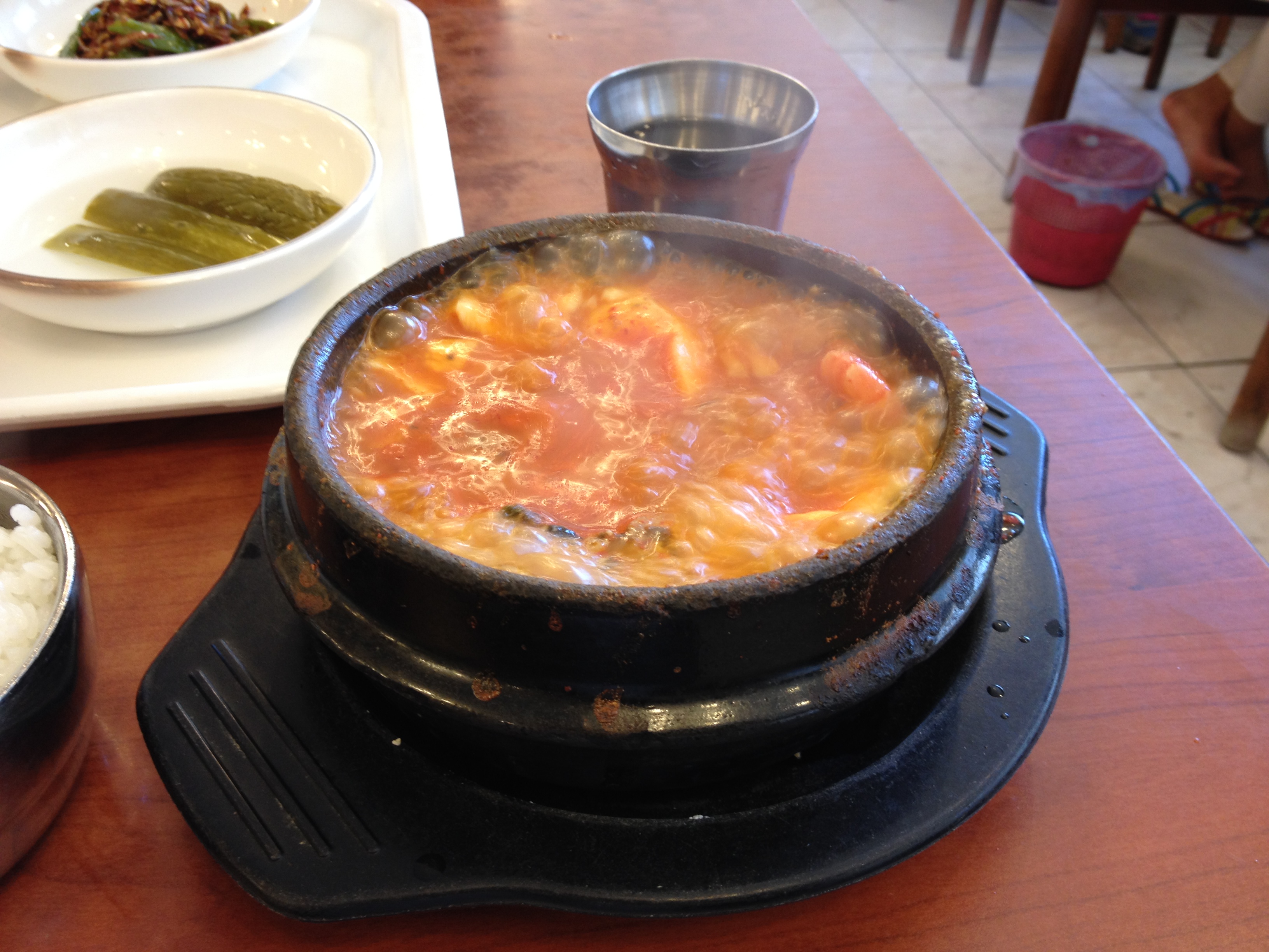 お昼時になり、何が食べたいか聞かれましたが、思い浮かばず、何でもいいですよと答えると、同行の彼は、スンドゥブチゲの店に連れて行ってくれました。